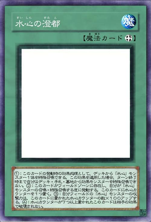 | ①:このカードの発動時の効果処理として、デッキから「水心」モンスター1体を特殊召喚できる。この効果を適用した場合、ターン終了時まで自分はデッキ・手札・墓地から効果モンスターを特殊召喚できない。②:このカードがフィールドゾーンに存在し、自分が「水心」モンスターの召喚・特殊召喚する度に発動する。このカードに水心カウンターを1つ置く。③:自分フィールドの「水心」モンスターの攻撃力は、このカードに置かれた水心カウンターの数×100アップする。④:水心カウンターが7つ以上置かれたこのカードは相手の効果で破壊されない。 | |||