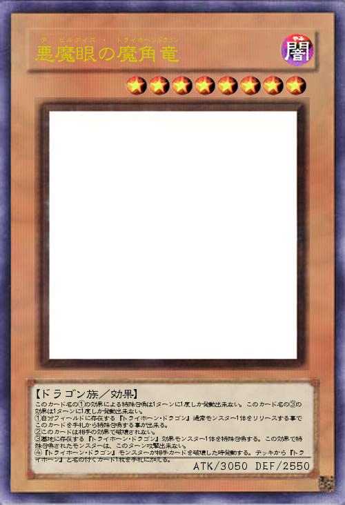 | このカード名の①の効果による特殊召喚は1ターンに1度しか発動出来ない。このカード名の③の効果は1ターンに1度しか発動出来ない。 ①自分フィールドに存在する『トライホーン・ドラゴン』通常モンスター1体をリリースする事でこのカードを手札から特殊召喚する事が出来る。 ②このカードは相手の効果で破壊されない。 ③墓地に存在する『トライホーン・ドラゴン』効果モンスター1体を特殊召喚する。この効果で特殊召喚されたモンスターは、このターン攻撃出来ない。 ④『トライホーン・ドラゴン』モンスターが相手カードを破壊した時発動する。デッキから『トライホーン』と名の付くカード1枚を手札に加える。 | |||