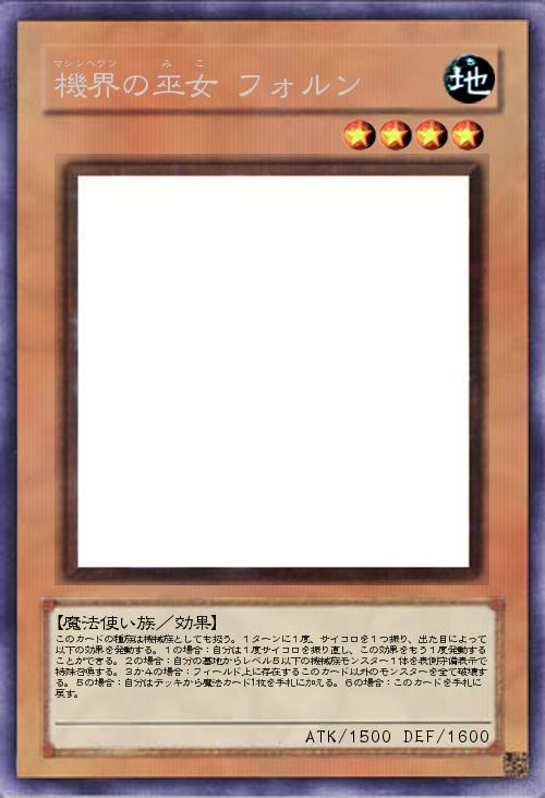 | このカードの種族は機械族としても扱う。1ターンに1度、サイコロを1つ振り、出た目によって以下の効果を発動する。1の場合:自分は1度サイコロを振り直し、この効果をもう1度発動することができる。2の場合:自分の墓地からレベル5以下の機械族モンスター1体を表側守備表示で特殊召喚する。3か4の場合:フィールド上に存在するこのカード以外のモンスターを全て破壊する。5の場合:自分はデッキから魔法カード1枚を手札に加える。6の場合:このカードを手札に戻す。 | |||