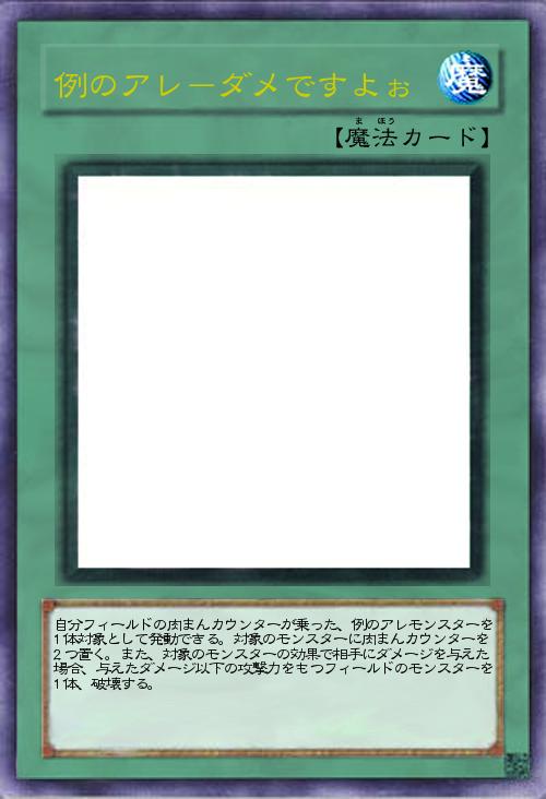 | 自分フィールドの肉まんカウンターが乗った、例のアレモンスターを1体対象として発動できる。対象のモンスターに肉まんカウンターを2つ置く。また、対象のモンスターの効果で相手にダメージを与えた場合、与えたダメージ以下の攻撃力をもつフィールドのモンスターを1体、破壊する。 | |||