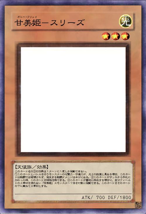 | このカード名の③の効果は1ターンに1度しか発動できない。 ①このカードとバトルを行うモンスターの攻撃力・守備力が、元々の数値と異なる場合、このカードは戦闘では破壊されず、発生する戦闘ダメージは半分になる。②このカードがデッキから手札に加わった時、このカードを特殊召喚できる。③このカードが墓地に存在する場合に、自分フィールドのX素材を持たない「甘美姫」Xモンスター1体を対象に発動できる。このカードをそのカードの下に重ねてX素材とする。 | |||