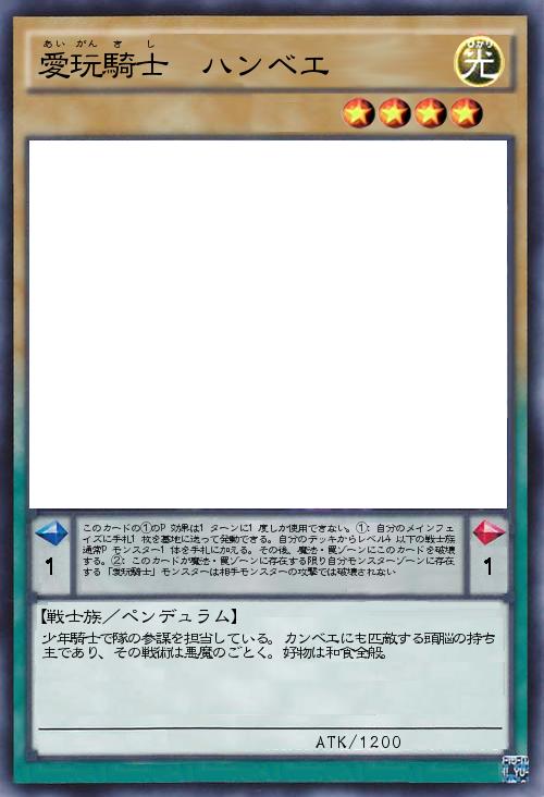 | このカードの①のP効果は1ターンに1度しか使用できない。①:自分のメインフェイズに手札1枚を墓地に送って発動できる。自分のデッキからレベル4以下の戦士族通常Pモンスター1体を手札に加える。その後、魔法・罠ゾーンにこのカードを破壊する。②:このカードが魔法・罠ゾーンに存在する限り自分モンスターゾーンに存在する「愛玩騎士」モンスターは相手モンスターの攻撃では破壊されない | |||