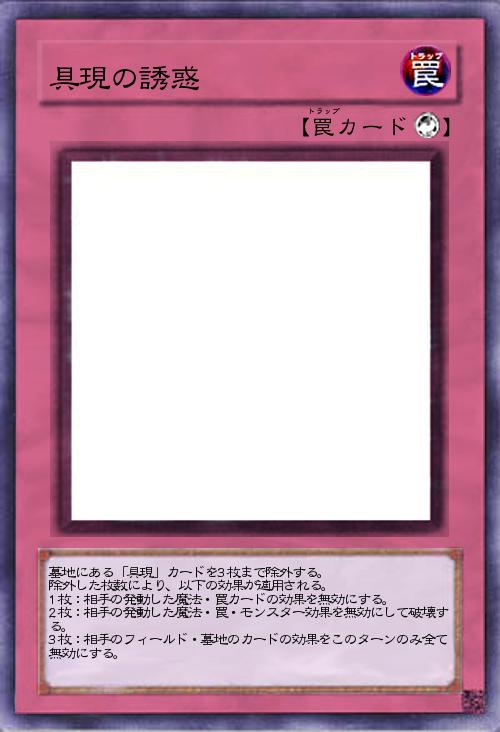 | 墓地にある「具現」カードを3枚まで除外する。 除外した枚数により、以下の効果が適用される。 1枚:相手の発動した魔法・罠カードの効果を無効にする。 2枚:相手の発動した魔法・罠・モンスター効果を無効にして破壊する。 3枚:相手のフィールド・墓地のカードの効果をこのターンのみ全て無効にする。 | |||