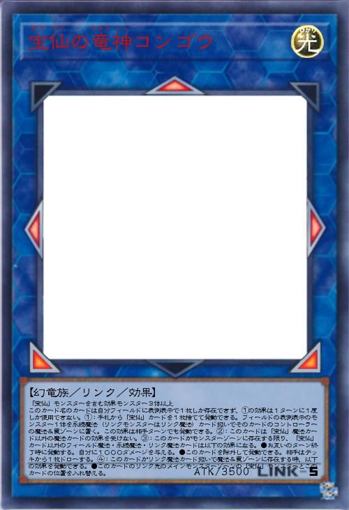 | 「宝仙」モンスターを含む効果モンスター3体以上 このカード名のカードは自分フィールドに表側表示で1枚しか存在できず、①の効果は1ターンに1度しか使用できない。①:手札から「宝仙」カードを1枚捨てて発動できる。フィールドの表側表示のモンスター1体を永続魔法(リンクモンスターはリンク魔法)カード扱いでそのカードのコントローラーの魔法&罠ゾーンに置く。この効果は相手ターンでも発動できる。②:このカードは「宝仙」魔法カード以外の魔法カードの効果を受けない。③:このカードがモンスターゾーンに存在する限り、「宝仙」カード以外のフィールド魔法・永続魔法・リンク魔法カードは以下の効果になる。●お互いのターン終了時に発動する。自分に1000ダメージを与える。●このカードを除外して発動できる。相手はデッキから1枚ドローする。④:このカードがリンク魔法カード扱いで魔法&罠ゾーンに存在する時、以下の効果を発動でき | |||