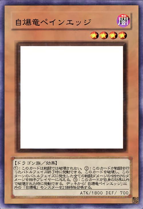| ①:このカードは戦闘では破壊されない。②:このカードが戦闘を行ったバトルフェイズ終了時に発動できる。このカードを破壊し、このターンのバトルフェイズに発生した全ての戦闘ダメージの合計分のダメージを相手プレイヤーに与える。③:このカードが自身の効果以外で破壊された時に発動できる。デッキから「自爆竜ペインエッジ」以外の「自爆竜」モンスターを2体特殊召喚する。 | |||
