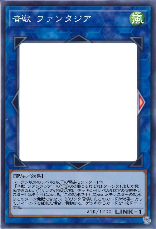| トークン以外のレベル3以下の雷族モンスター1体 「音獣 ファンタジア」の①②の効果はそれぞれ1ターンに1度しか発動できない。①リンク召喚成功時、デッキからレベル3以下の雷族モンスター1体を手札に加える。この効果で手札に加えたモンスターの効果はこのターン発動できない。②リンク召喚したこのカードが効果によってフィールドを離れた場合に発動する。デッキからカードを1枚ドローする。 | |||
