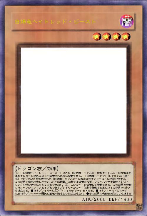 | ①:「自爆竜ヘイトレッド・ビースト」以外の「自爆竜」モンスターが相手モンスターの攻撃または相手のカード効果によって破壊された時に発動できる。「自爆竜トークン」(ドラゴン族・闇・星3・攻/守1000)を破壊された「自爆竜」モンスターの数だけ相手フィールドに特殊召喚する。この効果で特殊召喚したモンスターは戦闘、効果では破壊されず、リリースできず融合・S・X・リンク召喚の素材にすることもできない。②:このカードを破壊して発動できる。この効果を発動したターンのエンドフェイズまで相手プレイヤーがカード効果を発動する度に以下の効果から1つを適応する。●相手プレイヤーに500ポイントのダメージを与える。●相手フィールドのカード1枚を相手プレイヤーが選択し墓地へ送らなければならない。●その効果の発動を無効にし破壊する | |||