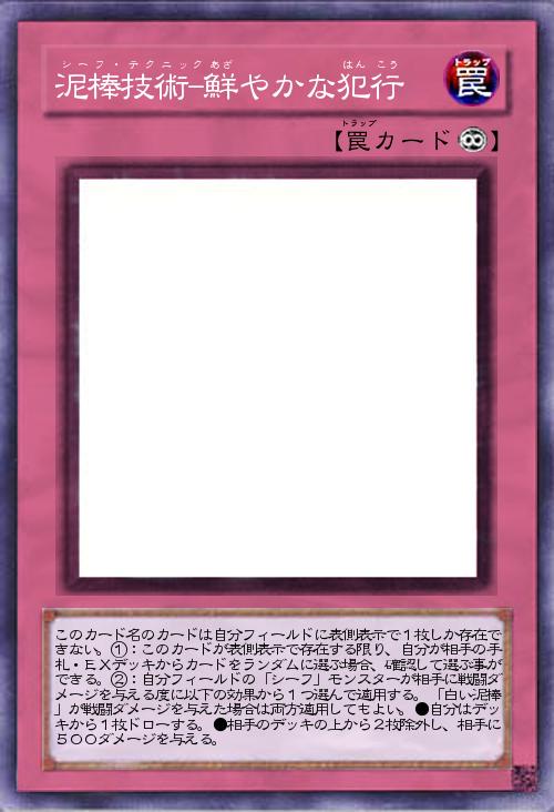 | このカード名のカードは自分フィールドに表側表示で1枚しか存在できない。①:このカードが表側表示で存在する限り、自分が相手の手札・EXデッキからカードをランダムに選ぶ場合、確認して選ぶ事ができる。②:自分フィールドの「シーフ」モンスターが相手に戦闘ダメージを与える度に以下の効果から1つ選んで適用する。「白い泥棒」が戦闘ダメージを与えた場合は両方適用してもよい。●自分はデッキから1枚ドローする。●相手のデッキの上から2枚除外し、相手に500ダメージを与える。 | |||