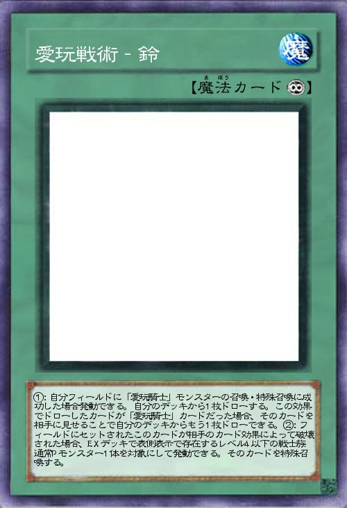 | ①:自分フィールドに「愛玩騎士」モンスターの召喚・特殊召喚に成功した場合発動できる。自分のデッキから1枚ドローする。この効果でドローしたカードが「愛玩騎士」カードだった場合、そのカードを相手に見せることで自分のデッキからもう1枚ドローできる。②:フィールドにセットされたこのカードが相手のカード効果によって破壊された場合、EXデッキで表側表示で存在するレベル4以下の戦士族通常Pモンスター1体を対象にして発動できる。そのカードを特殊召喚する。 | |||
