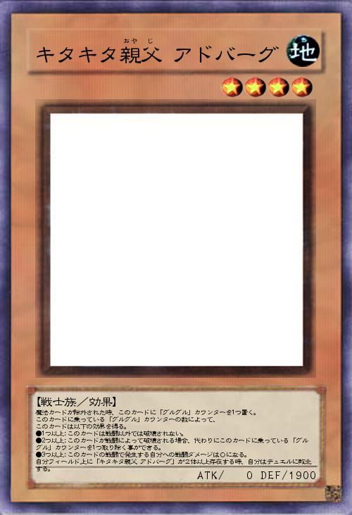 | 魔法カードが除外された時、このカードに「グルグル」カウンターを1つ置く。 このカードに乗っている「グルグル」カウンターの数によって、 このカードは以下の効果を得る。 ●1つ以上:このカードは戦闘以外では破壊されない。 ●2つ以上:このカードが戦闘によって破壊される場合、代わりにこのカードに乗っている「グルグル」カウンターを1つ取り除く事ができる。 ●3つ以上:このカードの戦闘で発生する自分への戦闘ダメージは0になる。 自分フィールド上に「キタキタ親父 アドバーグ」が2体以上存在する時、自分はデュエルに敗北する。 | |||