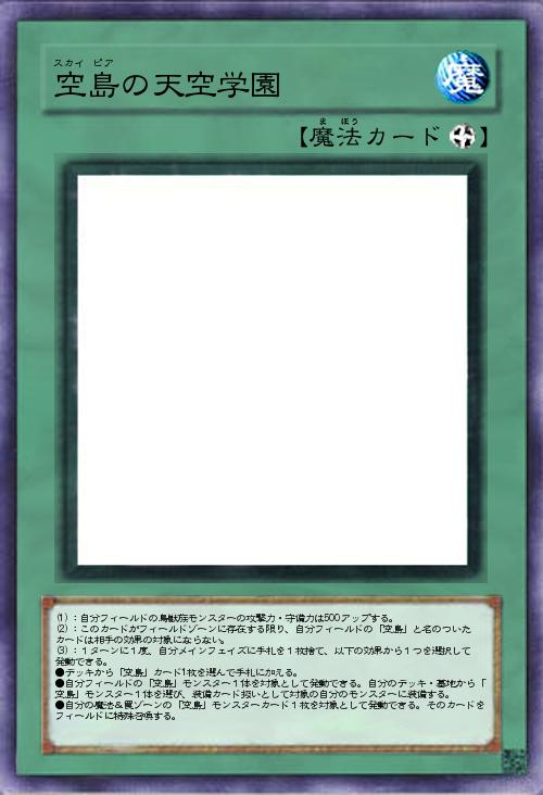 | (1):自分フィールドの鳥獣族モンスターの攻撃力・守備力は500アップする。 (2):このカードがフィールドゾーンに存在する限り、自分フィールドの「空島」と名のついたカードは相手の効果の対象にならない。 (3):1ターンに1度、自分メインフェイズに手札を1枚捨て、以下の効果から1つを選択して発動できる。 ●デッキから「空島」カード1枚を選んで手札に加える。 ●自分フィールドの「空島」モンスター1体を対象として発動できる。自分のデッキ・墓地から「空島」モンスター1体を選び、装備カード扱いとして対象の自分のモンスターに装備する。 ●自分の魔法&罠ゾーンの「空島」モンスターカード1枚を対象として発動できる。そのカードをフィールドに特殊召喚する。 | |||