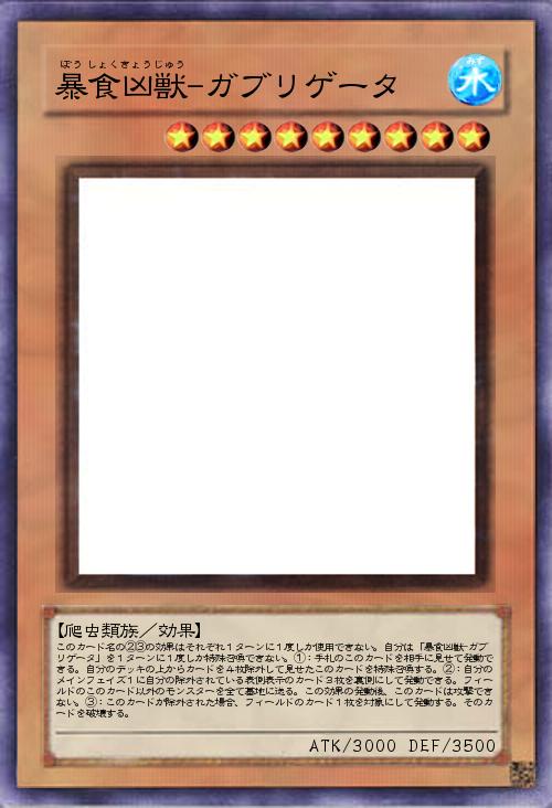 | このカード名の②③の効果はそれぞれ1ターンに1度しか使用できない。自分は「暴食凶獣-ガブリゲータ」を1ターンに1度しか特殊召喚できない。①:手札のこのカードを相手に見せて発動できる。自分のデッキの上からカードを4枚除外して見せたこのカードを特殊召喚する。②:自分のメインフェイズ1に自分の除外されている表側表示のカード3枚を裏側にして発動できる。フィールドのこのカード以外のモンスターを全て墓地に送る。この効果の発動後、このカードは攻撃できない。③:このカードが除外された場合、フィールドのカード1枚を対象にして発動する。そのカードを破壊する。 | |||