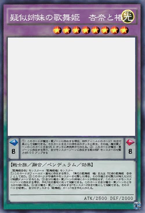 | 「歌舞姫杏奈」モンスター+「歌舞姫椿」モンスター ①:このカードがフィールド・墓地に存在する限り、「黒花の歌舞姫 椿」または「花候の歌舞姫 杏奈」として扱う。②:このカードが守備表示モンスターを攻撃した場合、その守備力を攻撃力が超えた分だけ戦闘ダメージを与える。③:自分の魔法・罠ゾーンの両端にカードが存在せず、このカードがモンスターゾーンに存在する場合、手札1枚を墓地に送って発動できる。このカードを自分魔法・罠ゾーンのどちらかの端に張る。④:自分魔法・罠ゾーンに存在するPモンスター2体を対象にして発動できる。そのカードを破壊し、自分のデッキから「歌舞姫」カード1枚を手札に加える。 | |||