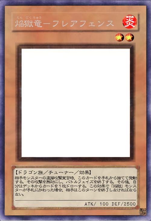 | 相手モンスターの直接攻撃宣言時、このカードを手札から捨てて発動する。その攻撃を無効にし、バトルフェイズを終了する。その後、自分はデッキからカードを1枚ドローする。この効果で「焔獄」モンスターが手札に加わった場合、相手はこのターンを終了しなければならない。 | |||