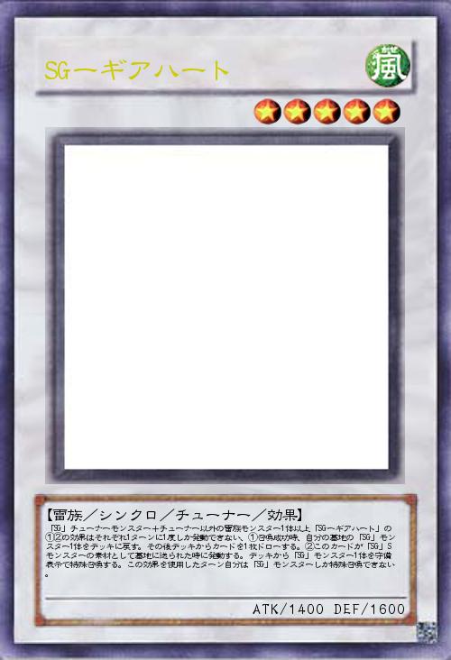 | 「SG」チューナーモンスター+チューナー以外の雷族モンスター1体以上「SGーギアハート」の①②の効果はそれぞれ1ターンに1度しか発動できない、①召喚成功時、自分の墓地の「SG」モンスター1体をデッキに戻す。その後デッキからカードを1枚ドローする。②このカードが「SG」Sモンスターの素材として墓地に送られた時に発動する。デッキから「SG」モンスター1体を守備表示で特殊召喚する。この効果を使用したターン自分は「SG」モンスターしか特殊召喚できない。 | |||