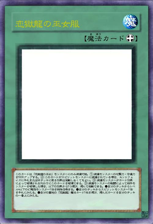 | このカードは「恋獄龍の巫女」モンスターにのみ装備可能。①:装備モンスターの攻撃力・守備力を1000アップする。②:このカードがスピリットモンスターに装備されている場合、エンドフェイズに手札またはEXデッキに戻る効果は発動しなくてもよい。③:装備モンスターがカード効果によって破壊される代わりにこのカードを破壊できる。③:装備モンスターの戦闘によって相手モンスターを破壊した場合、以下の効果から1つ選び、選んで発動できる。●自分のデッキからレベル4以下の幻竜族モンスター1体を特殊召喚する。●自分のデッキからスピリットモンスター1体を手札に加える。●自分の墓地の「恋獄龍」魔法カード1枚を選び、選んだカードを自分のデッキの一番上に加える。 | |||