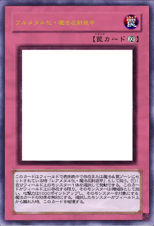 | このカードはフィールドで表側表示で存在または魔法&罠ゾーンにセットされている時「レアメタル化・魔法反射装甲」として扱う。①:自分フィールド上のモンスター1体を選択して発動できる。このカードがフィールド上に存在する限り、そのモンスターは機械族として扱い、攻撃力は1000ポイントアップし、そのモンスターを対象にする魔法カードの効果を無効にする。選択したモンスターがフィールド上から離れた時、このカードを破壊する。 | |||