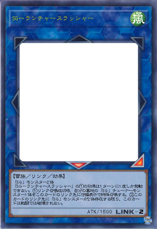 | 「SG」モンスター2体 「SGーランチャースラッシャー」の①の効果は1ターンに1度しか発動できない。①リンク召喚成功時、自分の墓地の「SG」チューナーモンスター1体をこのカードのリンク先に守備表示で特殊召喚する。②このカードのリンク先に「SG」モンスターが2体存在する限り、このカードは戦闘では破壊されない。 | |||