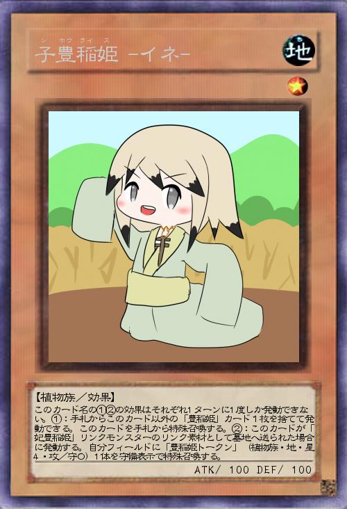 | このカード名の①②の効果はそれぞれ1ターンに1度しか発動できない。①:手札からこのカード以外の「豊稲姫」カード1枚を捨てて発動できる。このカードを手札から特殊召喚する。②:このカードが「妃豊稲姫」リンクモンスターのリンク素材として墓地へ送られた場合に発動する。自分フィールドに「豊稲姫トークン」(植物族・地・星4・攻/守0)1体を守備表示で特殊召喚する。 | |||