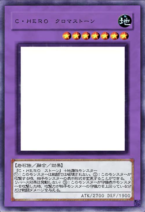 | 『C・HERO ストーン』+地属性モンスター ①:このモンスターは戦闘では破壊されない。②:このモンスターが攻撃する時、相手モンスターの表示形式を変更することができる。(リバース効果は発動しない)③:このモンスターが守備表示モンスターを攻撃した時、攻撃力が相手モンスターの守備力を上回っている分だけ戦闘ダメージを与える。 | |||