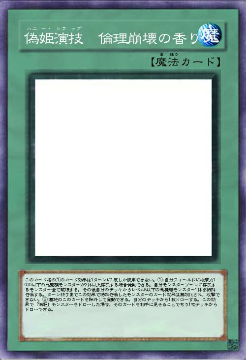 | このカード名の①のカード効果は1ターンに1度しか使用できない。①:自分フィールドに攻撃力1000以下の悪魔族モンスターが2体以上存在する場合発動できる。自分モンスターゾーンに存在するモンスター全て破壊する。その後自分のデッキからレベル8以下の悪魔族モンスター1体を特殊召喚する。ターン終了までこの効果で特殊召喚したモンスターのカード効果は無効化され、攻撃できない。②:墓地のこのカードを除外して発動できる。自分のデッキから1枚ドローする。この効果で「偽姫」モンスターをドローした場合、そのカードを相手に見せることでもう1枚デッキからドローできる。 | |||