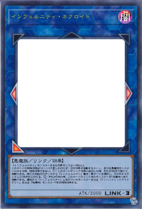 | 「インフェルニティ」モンスターを含む効果モンスター2体以上 このカードの特殊召喚は1ターンに1度しか行えず、②の効果を発動するターン、自分は悪魔族モンスター以外を召喚、特殊召喚できない。①:このカードがリンク召喚に成功した時、手札を3枚まで捨てて発動できる。捨てた枚数だけデッキから「インフェルニティ」魔法・罠カードを選択し、その中からランダムに1枚手札に加える。②:手札が0枚の時、このカードのリンク先のモンスターを1体墓地へ送り発動できる。墓地から「インフェルニティ」と名のついたモンスターまたは「ワンハンドレッドアイドラゴン」または「地縛神」モンスター1体を特殊召喚する。 | |||