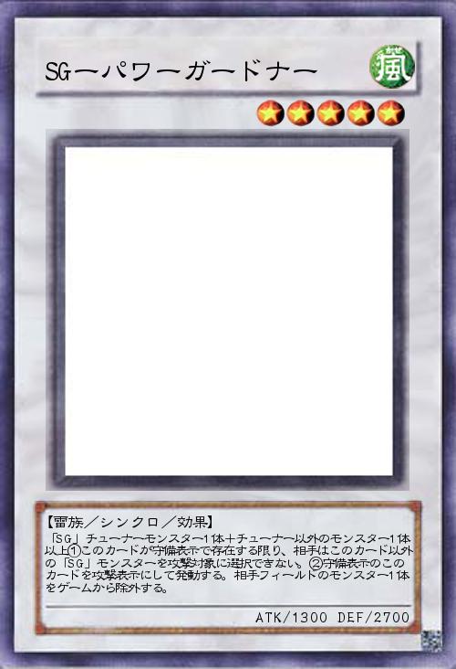 | 「SG」チューナーモンスター1体+チューナー以外のモンスター1体以上①このカードが守備表示で存在する限り、相手はこのカード以外の「SG」モンスターを攻撃対象に選択できない。②守備表示のこのカードを攻撃表示にして発動する。相手フィールドのモンスター1体をゲームから除外する。 | |||