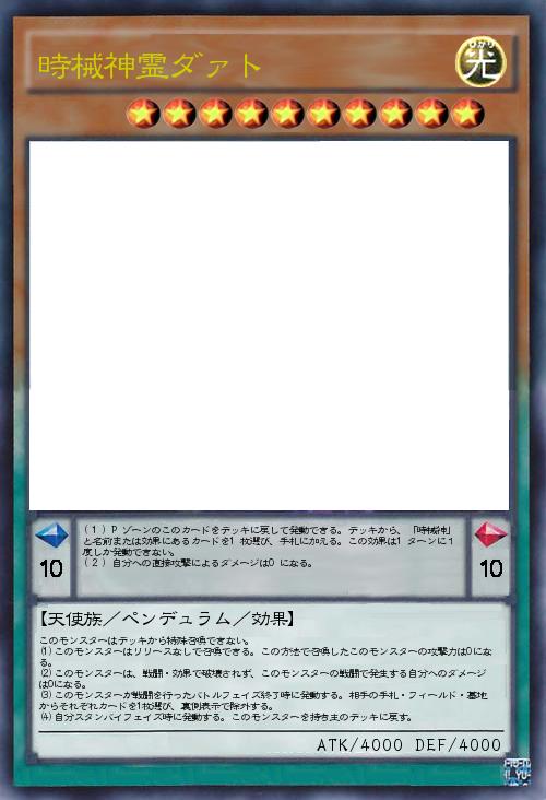 | (1)Pゾーンのこのカードをデッキに戻して発動できる。デッキから、「時械神」と名前または効果にあるカードを1枚選び、手札に加える。この効果は1ターンに1度しか発動できない。 (2)自分への直接攻撃によるダメージは0になる。 | |||