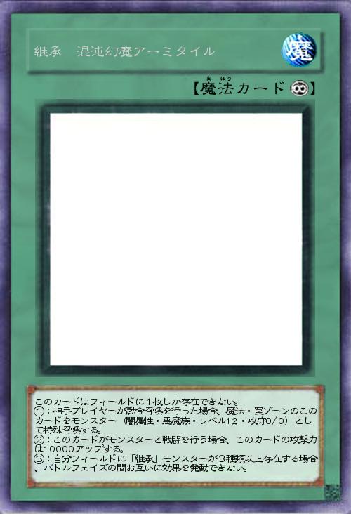 | このカードはフィールドに1枚しか存在できない。 ①:相手プレイヤーが融合召喚を行った場合、魔法・罠ゾーンのこのカードをモンスター(闇属性・悪魔族・レベル12・攻守0/0)として特殊召喚する。 ②:このカードがモンスターと戦闘を行う場合、このカードの攻撃力は10000アップする。 ③:自分フィールドに「継承」モンスターが3種類以上存在する場合、バトルフェイズの間お互いに効果を発動できない。 | |||