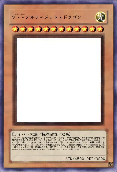 | このカードは通常召喚できない。自分のEXデッキから「青眼の究極竜」1体を除外した場合に特殊召喚できる。自分は「V・V」モンスターを1ターンに1度しか特殊召喚できない。このカード名の③の効果は1ターンに1度しか発動できない。①:フィールドのこのカードは戦闘・効果によって破壊されない。②:このカードの戦闘によってお互いに発生する戦闘ダメージは0になる。③:自分メインフェイズ1に発動できる。相手フィールドのモンスターを全て墓地に送り、墓地に送ったモンスターの数×500ダメージを相手に与えてターンを終了する。 | |||