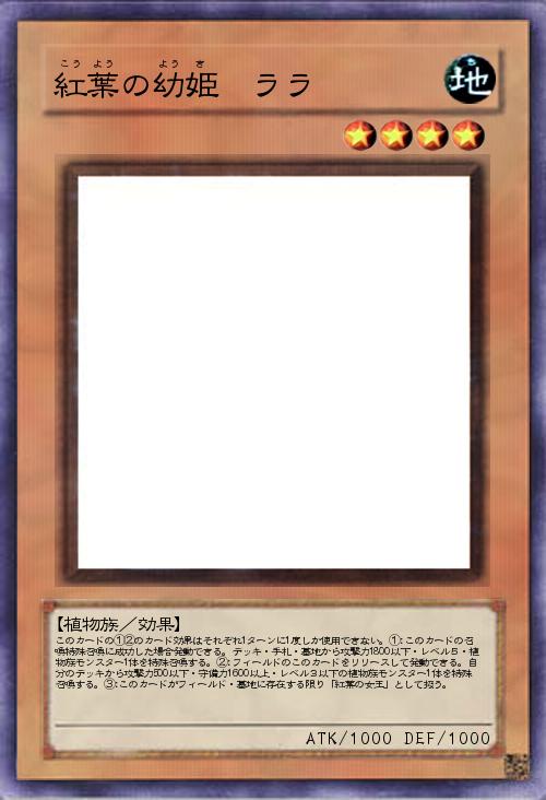 | このカードの①②のカード効果はそれぞれ1ターンに1度しか使用できない。①:このカードの召喚特殊召喚に成功した場合発動できる。デッキ・手札・墓地から攻撃力1800以下・レベル5・植物族モンスター1体を特殊召喚する。②:フィールドのこのカードをリリースして発動できる。自分のデッキから攻撃力500以下・守備力1600以上・レベル3以下の植物族モンスター1体を特殊召喚する。③:このカードがフィールド・墓地に存在する限り「紅葉の女王」として扱う。 | |||