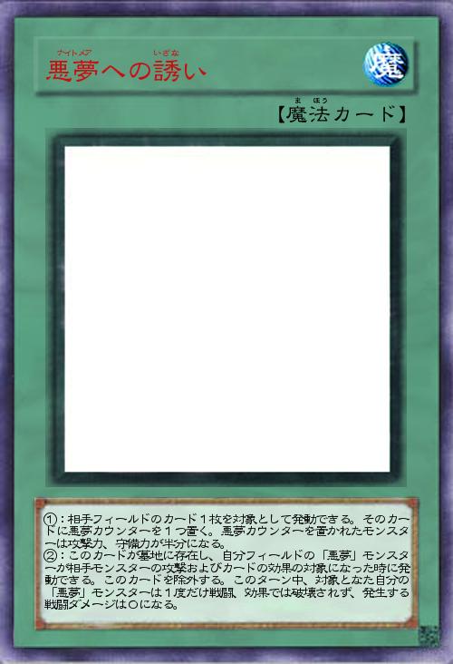 | ①:相手フィールドのカード1枚を対象として発動できる。そのカードに悪夢カウンターを1つ置く。悪夢カウンターを置かれたモンスターは攻撃力、守備力が半分になる。 ②:このカードが墓地に存在し、自分フィールドの「悪夢」モンスターが相手モンスターの攻撃およびカードの効果の対象になった時に発動できる。このカードを除外する。このターン中、対象となた自分の「悪夢」モンスターは1度だけ戦闘、効果では破壊されず、発生する戦闘ダメージは0になる。 | |||