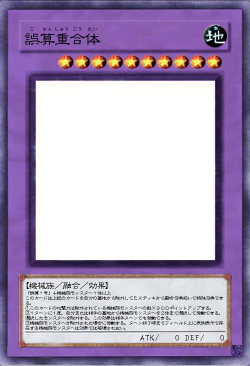 | 「誤算1号」+機械族モンスター1体以上 このカードは上記のカードを自分の墓地から除外してEXデッキから融合召喚扱いで特殊召喚できる。 ①このカードの攻撃力は除外されている機械族モンスターの数×300ポイントアップする。 ②1ターンに1度、自分または相手の墓地から機械族モンスターを2体まで選択して発動できる。選択したモンスターを除外する。この効果は相手ターンでも発動できる。 ③機械族モンスターが除外された場合に発動する。ターン終了時までフィールド上に表側表示で存在する機械族モンスターは効果では破壊されない。 | |||