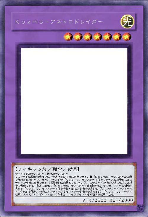 | サイキック族モンスター+機械族モンスター このカードは融合召喚及び以下の方法でのみ特殊召喚できる。●「Kozmo」モンスターが効果で除外されたターン、自分フィールドの「Kozmo」モンスター1体をリリースした場合にEXデッキから特殊召喚できる(「融合」は必要としない)。①:このカードが特殊召喚に成功した場合に発動できる。自分の墓地の「Kozmo」モンスター1体を除外し、そのモンスターと種族が異なる「Kozmo」モンスター1体を手札・墓地から特殊召喚する。②:このカードがフィールドに存在する限り、相手はEXデッキからモンスターを特殊召喚できず、「Kozmo」カードの効果によってライフポイントを払う効果は、ライフポイントを回復する効果になる。 | |||