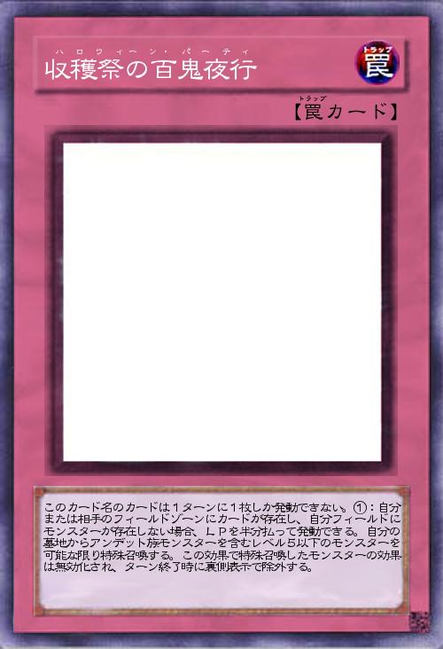 | このカード名のカードは1ターンに1枚しか発動できない。①:自分または相手のフィールドゾーンにカードが存在し、自分フィールドにモンスターが存在しない場合、LPを半分払って発動できる。自分の墓地からアンデット族モンスターを含むレベル5以下のモンスターを可能な限り特殊召喚する。この効果で特殊召喚したモンスターの効果は無効化され、ターン終了時に裏側表示で除外する。 | |||