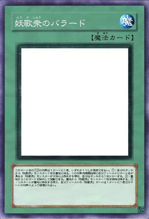 | このカード名の①②の効果は1ターンに1度、いずれか1つしか使用できない。①:自分のデッキから「妖歌衆」モンスター1体を墓地に送る。この効果処理開始時に自分フィールドにカード名が異なる「妖歌衆」モンスターが3体以上存在する場合、自分はデッキから1枚ドローする。②:墓地からこのカードを除外して発動できる。墓地から「妖歌衆」モンスター1体を特殊召喚する。③:このカードが墓地に存在する限り、自分フィールドの「妖歌衆」カードは1ターンに1度だけカードの効果によって破壊されない。 | |||