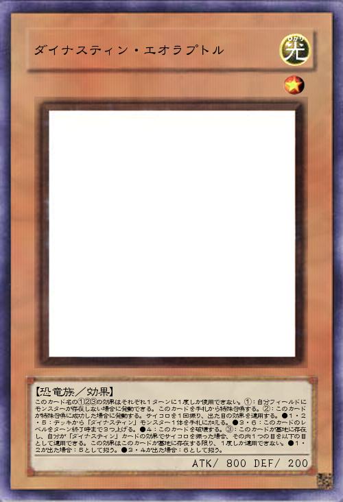 | このカード名の①②③の効果はそれぞれ1ターンに1度しか使用できない。①:自分フィールドにモンスターが存在しない場合に発動できる。このカードを手札から特殊召喚する。②:このカードが特殊召喚に成功した場合に発動する。サイコロを1回振り、出た目の効果を適用する。●1・2・5:デッキから「ダイナスティン」モンスター1体を手札に加える。●3・6:このカードのレベルをターン終了時まで3つ上げる。●4:このカードを破壊する。③:このカードが墓地に存在し、自分が「ダイナスティン」カードの効果でサイコロを振った場合、その内1つの目を以下の目として適用できる。この効果はこのカードが墓地に存在する限り、1度しか適用できない。●1・2が出た場合:5として扱う。●3・4が出た場合:6として扱う。 | |||