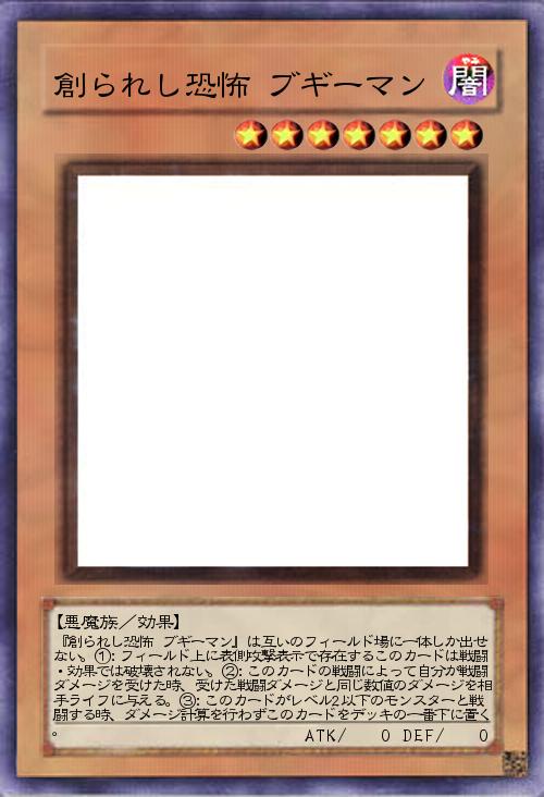 | 『創られし恐怖 ブギーマン』は互いのフィールド場に一体しか出せない。①:フィールド上に表側攻撃表示で存在するこのカードは戦闘・効果では破壊されない。②:このカードの戦闘によって自分が戦闘ダメージを受けた時、受けた戦闘ダメージと同じ数値のダメージを相手ライフに与える。③:このカードがレベル2以下のモンスターと戦闘する時、ダメージ計算を行わずこのカードをデッキの一番下に置く。 | |||