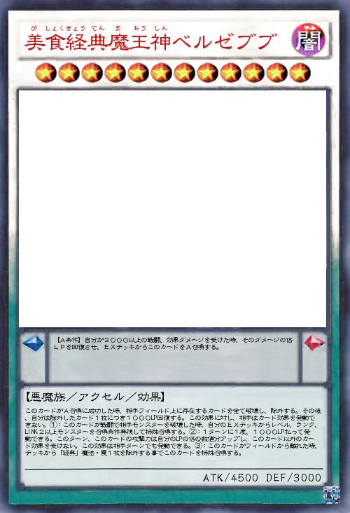 | このカードがA召喚に成功した時、相手フィールド上に存在するカードを全て破壊し、除外する。その後、自分は除外したカード1枚につき1000LP回復する。この効果に対し、相手はカード効果を発動できない。①:このカードが戦闘で相手モンスターを破壊した時、自分のEXデッキからレベル、ランク、LINK2以上モンスターを召喚条件無視して特殊召喚する。②:1ターンに1度、1000LP払って発動できる。このターン、このカードの攻撃力は自分のLPの倍の数値分アップし、このカード以外のカード効果を受けない。この効果は相手ターンでも発動できる。③:このカードがフィールドから離れた時、デッキから「経典」魔法・罠1枚を除外する事でこのカードを特殊召喚する。 | |||