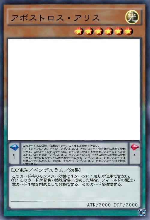 | このカード名の②のP効果は1ターンに1度しか使用できない。 ①:1ターンに1度、手札の「アポストロス」Pモンスター1体を相手に見せて発動できる。このカードのPスケールは、ターン終了時まで見せたモンスターのレベル分上がる。②:自分が「アポストロス」モンスターのみのP召喚に成功した場合に発動できる。自分のEXデッキに表側表示で存在する「アポストロス」Pモンスター1体を選んで手札に加える。その後、手札から「アポストロス」Pモンスター1体を特殊召喚できる。 | |||