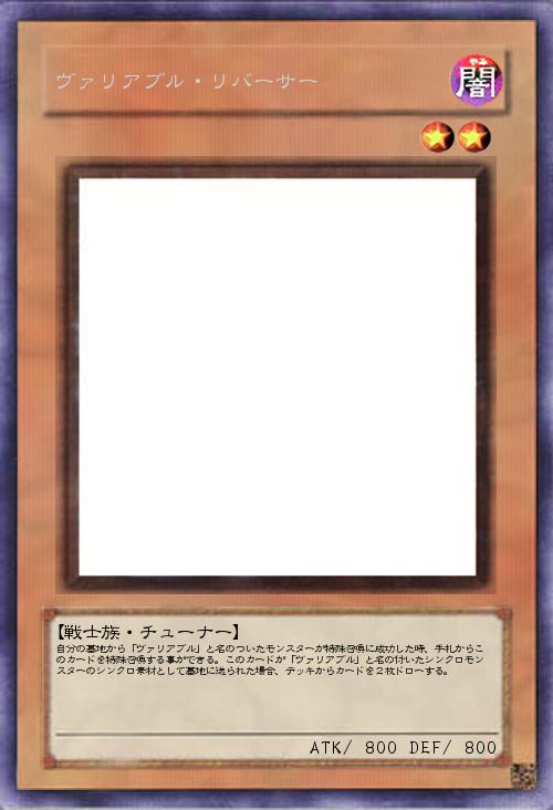 | 自分の墓地から「ヴァリアブル」と名のついたモンスターが特殊召喚に成功した時、手札からこ のカードを特殊召喚する事ができる。このカードが「ヴァリアブル」と名の付いたシンクロモン スターのシンクロ素材として墓地に送られた場合、デッキからカードを2枚ドローする。 | |||