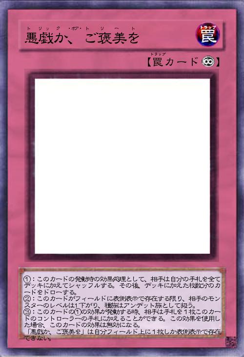 | ①:このカードの発動時の効果処理として、相手は自分の手札を全てデッキに加えてシャッフルする。その後、デッキに加えた枚数分のカードをドローする。 ②:このカードがフィールドに表側表示で存在する限り、相手のモンスターのレベルは1下がり、種族はアンデット族として扱う。 ③:このカードの①の効果が発動する時、相手は手札を1枚このカードのコントローラーの手札に加えることができる。この効果を使用した場合、このカードの効果は無効になる。 「悪戯か、ご褒美を」は自分フィールド上に1枚しか表側表示で存在できない。 | |||