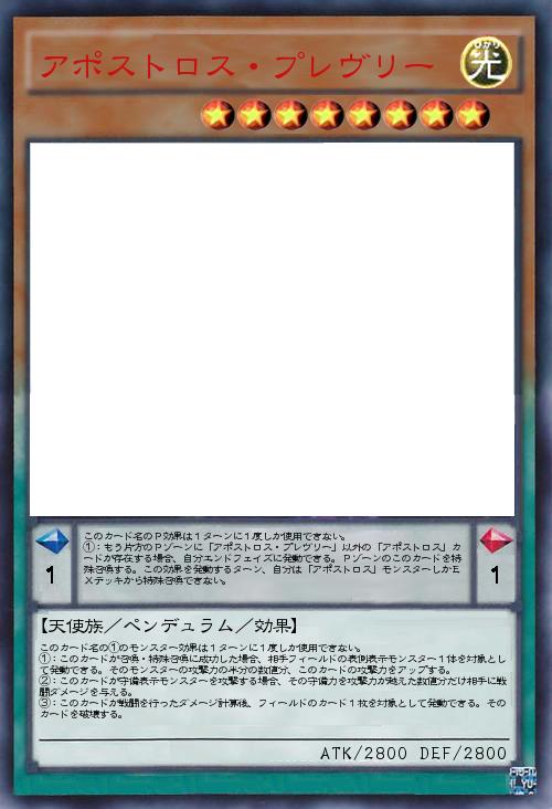 もう片方にプレヴリー以外のアポストロスがいると特殊召喚できるP効果を持ちます。???「レベル8のモンスターをコスト無しで召喚だと!?インチキ効果もいい加減にしろ!」