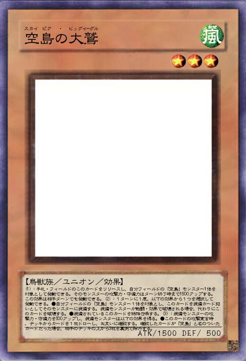| (1):手札・フィールドのこのカードをリリースし、自分フィールドの「空島」モンスター1体を対象として発動できる。そのモンスターの攻撃力・守備力はターン終了時まで1500アップする。この効果は相手ターンでも発動できる。(2):1ターンに1度、以下の効果から1つを選択して発動できる。●自分フィールドの「空島」モンスター1体を対象とし、このカードを装備カード扱いとしてそのモンスターに装備する。装備モンスターが戦闘・効果で破壊される場合、代わりにこのカードを破壊する。●装備されているこのカードを特殊召喚する。(3):装備モンスターの攻撃力・守備力を500アップし、装備モンスターは以下の効果を得る。●このカードの攻撃宣言時、デッキからカードを1枚ドローし、お互いに確認する。確認したカードが「空島」と名のついたカードだった場合、相手のデッキの上から3枚を裏側で除外する。 | |||
