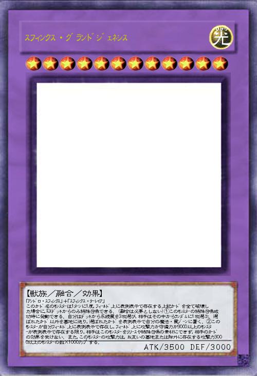 | 「アンドロ・スフィンクス」+「スフィンクス・テ-レイア」 このカ-ド名のモンスタ-は1タ-ンに1度,フィ-ルド上に表側表示で存在する上記カ-ドを全て破壊した場合に,EXデッキからのみ特殊召喚できる.(融合は必要としない)①このモンスタ-の特殊召喚成功時に発動できる.自分はデッキから永続罠を3枚選び,相手はその中からランダムに1枚選ぶ.選ばれたカ-ド以外を墓地に送り,選ばれたカ-ドを表側表示で自分の魔法・罠ゾ-ンに置く.②このモンスタ-が自分フィ-ルド上に表側表示で存在し,フィ-ルド上に攻撃力か守備力が3000以上のモンスタ-が表側表示で存在する限り,相手はこのモンスタ-をリリ-スや特殊召喚の素材にできず,相手のカ-ドの効果を受けない.また,このモンスタ-の攻撃力は,お互いの墓地または除外に存在する攻撃力3000以上のモンスタ-の数×1000アップする. | |||