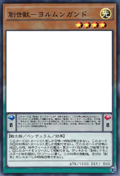 | このカードは「創世」モンスターしかP召喚できない。この効果は無効化されない。①このカードを破壊して発動できる。墓地の「創世」カードをデッキに戻す。その後、手札から「創世」モンスターを召喚する。②このカードを除外して発動できる。相手フィールド上のカード1枚を選んでデッキに戻す。その後、除外されている「創世」モンスターを特殊召喚する。 | |||