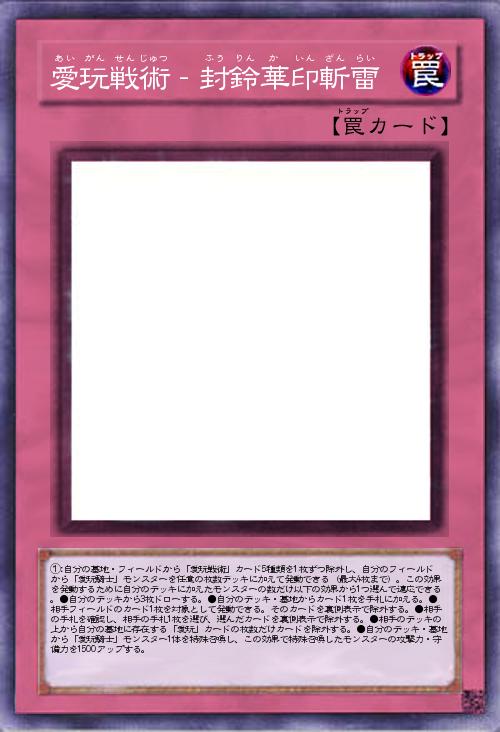 | ①:自分の墓地・フィールドから「愛玩戦術」カード5種類を1枚ずつ除外し、自分のフィールドから「愛玩騎士」モンスターを任意の枚数デッキに加えて発動できる(最大4枚まで)。この効果を発動するために自分のデッキに加えたモンスターの数だけ以下の効果から1つ選んで適応できる。●自分のデッキから3枚ドローする。●自分のデッキ・墓地からカード1枚を手札に加える。●相手フィールドのカード1枚を対象として発動できる。そのカードを裏側表示で除外する。●相手の手札を確認し、相手の手札1枚を選び、選んだカードを裏側表示で除外する。●相手のデッキの上から自分の墓地に存在する「愛玩」カードの枚数だけカードを除外する。●自分のデッキ・墓地から「愛玩騎士」モンスター1体を特殊召喚し、この効果で特殊召喚したモンスターの攻撃力・守備力を1500アップする。 | |||