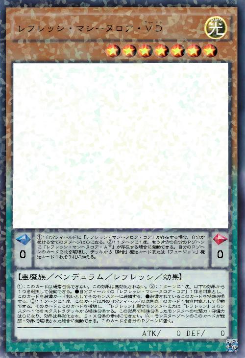 | ①:自分フィールドに「レフレッシ・マシーヌロア・コア」が存在する場合、自分が受ける全てのダメージは0になる。②:1ターンに1度、もう片方の自分のPゾーンに「レフレッシ・マシーヌロア・AF」が存在する場合に発動できる。自分のPゾーンのカード2枚を破壊し、デッキから「融合」魔法カードまたは「フュージョン」魔法カード1枚を手札に加える。 | |||