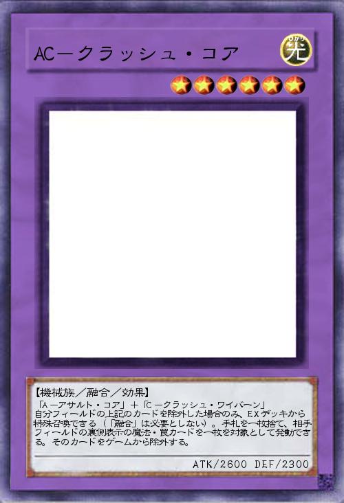 | 「A-アサルト・コア」+「C-クラッシュ・ワイバーン」 自分フィールドの上記のカードを除外した場合のみ、EXデッキから特殊召喚できる(「融合」は必要としない)。手札を一枚捨て、相手フィールドの裏側表示の魔法・罠カードを一枚を対象として発動できる。そのカードをゲームから除外する。 | |||