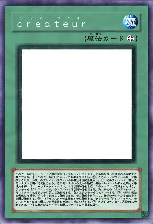 | このカードはフィールド上に存在する「レフレッシ」モンスターを4体除外した場合のみ発動する事ができる。①:このカードは他のカードの効果を受けない。②:このカードがフィールド上に存在する限り、お互いのプレイヤーはフィールド魔法を発動出来ない。③:相手フィールド・墓地のモンスターを選んで発動できる。そのモンスターの元々の種族・属性・レベル・効果・攻撃力・守備力を持つ「createurトークン」1体を特殊召喚する。このトークンが破壊された場合、デッキから「クレアトゥール」モンスター1体を特殊召喚できる。④:手札の「クレアトゥール」モンスター1枚をデッキに戻して発動できる。自分はデッキから2枚ドローする。⑤:相手が魔法を発動した場合、手札を1枚捨てて発動できる。その発動を無効にし、相手のデッキから魔法を1枚選び発動する。⑥:相手モンスターの直接宣言時に発動する。デッキから「クレアトゥール」モンスター | |||